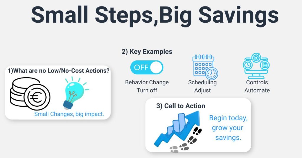 Achieving energy efficiency doesn’t require a hefty investment—small, low-cost actions can deliver real savings and build momentum for bigger changes. This blog highlights practical, no-cost or low-cost measures such as behavior change, scheduling adjustments, optimising controls, and fine-tuning setpoints. These quick wins are easy to implement and offer immediate results, helping you demonstrate value, engage your team, and lay the groundwork for future upgrades. By embedding these actions into your Energy Management System and celebrating early successes, you can create a culture of efficiency and scale up your efforts for lasting impact. Start small, prove value, then scale.